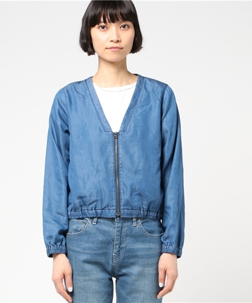 テンセル混の柔らかなデニムを使ったジップブルゾン。 ライトウェイトな着心地は肌寒い時の羽織りとして便利で、脱ぎ着の多いシーンでも持ち運びにかさばりません。 スカートや花柄ワンピースなど、甘めのアイテムとのコーディネートもおすすめです。