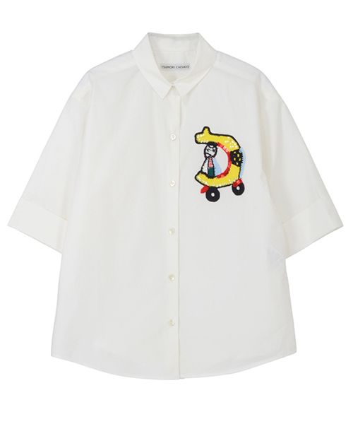 タテヨコともに毛羽の少ない良質な綿糸を使用して、高密度に織られた生地を使用した半袖のシャツです。 適度なハリとしなやかさがある素材に仕上がっています。 デザイナー津森が手描きした車のイラストを手編みで表現し、アップリケしています。