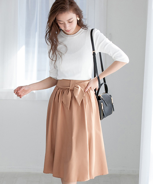 優雅に揺らめくふんわりスカートでシーズンスタイルを 波打つフレアシルエットが、華やかな印象のミディ丈スカート。ウエストをキュッとマークする太リボンは、メリハリのあるフィット&フレアをメイクします。主張しすぎないデザインなので、オンオフ問わず多彩に活躍します。