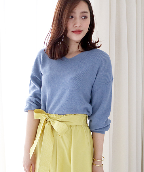 両Vネックでヌケ感のあるハイゲージ畦Vネックニット!トレンドのボリュームスリーブでベーシックを更新するデザイン。リラックスフォルムで着心地良く、スカートやワイドパンツまで着回しの出来る1枚です。