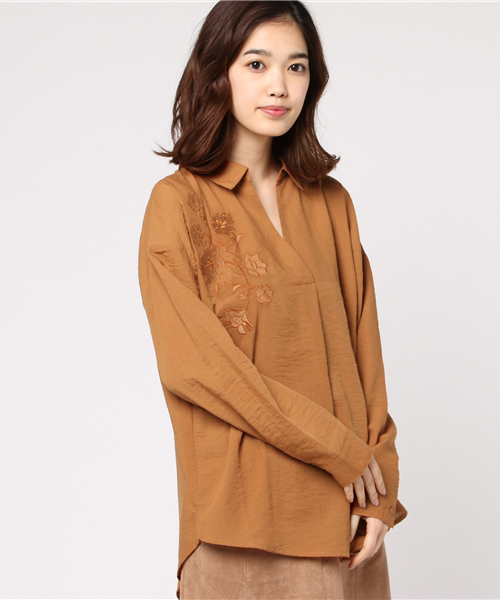 HIT中のスキッパーシャツに、同じく人気の刺繍を施した、トレンド盛りだくさんのシャツが登場!袖周りのゆったり感や、長めの後ろ丈などバランス上手になれるシルエットです。衿を後ろに抜いて着こなすと、より今っぽくなっておすすめ!