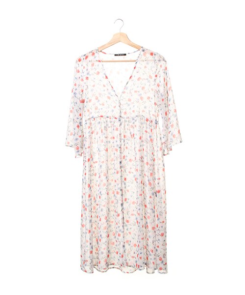 コーディネートを華やかにしてくれる小花柄のガウン。軽やかなシフォンの生地感がシーズンムード漂い、フロントボタンを閉じてワンピース風にもアレンジが楽しめる旬なアイテムです。胸下の切り替しのギャザーから、ふわっと広がる裾にVネックにフレアになった袖が華やかな印象にしてくれます。長めの着丈でさりげなくスタイルアップ効果も◎。デニムに合わせてきれいめカジュアルにはもちろん、ワイドパンツにあわせラフなスタイリングもオススメ◎。いつものコーデにさらっと羽織るだけで、トレンドライクなスタイルが完成する1枚です。・透け感あり