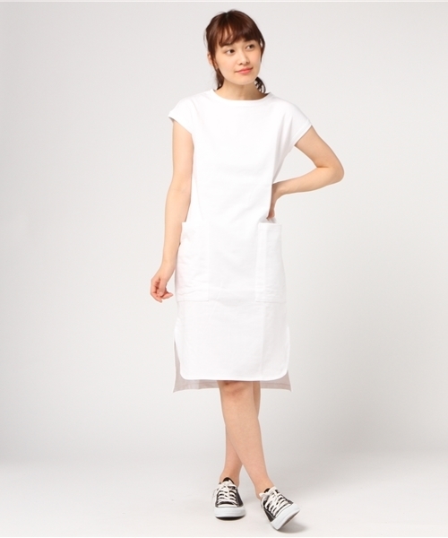 コットン100%のインレイに毛羽目立たなくさせた加工を施した生地を使ったノースリーブワンピースです。大きなポケットがアクセントです。下にデニムやジョガーパンツを合わせるのがオススメです。