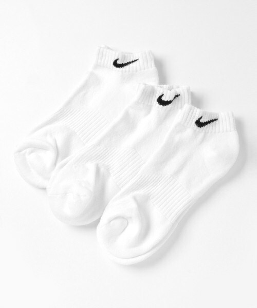 NIKE / 3P COTTON CUSHION LOW CUT SOCKS ナイキから定番のシンプルな3足組フィットソックスが入荷しました。 前モデル比約3倍の耐久性を持たせ、スポーツにも最適です。 アーチサポートで安定感のある履き心地で、快適なフィット感を生むY字ヒールを採用しております。 また、モイスチャーマネジメントで足を涼しく、ドライな状態に保ちます。 足首にスウッシュロゴが編み込みで入ったシンプルなデザインなので、何枚でもほしいアイテムです! シューズにはもちろん、サンダル組み合わせても良い感じです♪