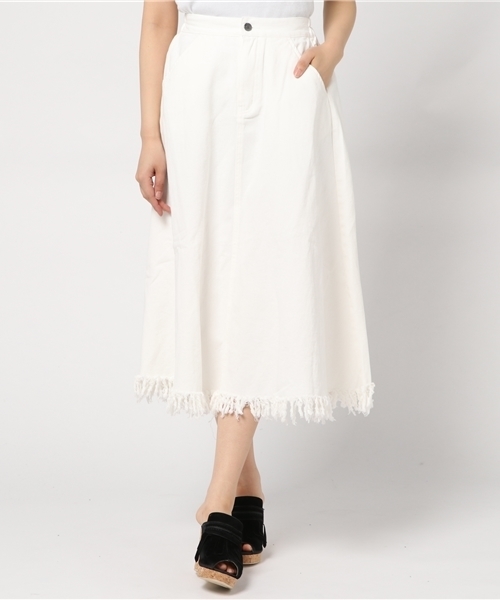 大人気のフリンジフレアデニムに加え、ロングスカートが新登場!! 裾はフリンジ加工に仕上げました! ウエスト背面はゴム仕様になっているので ストレスなく履いていただけること間違いなし☆