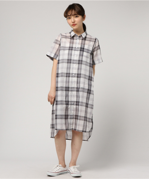 シワになりにくくお手入れのしやすいポリエステル混のチェックワンピース。 ワンピースとして着用するのはもちろん、前を開ければ羽織りにもなる優れもの。 今年らしくベルトでウエストマークしたり、衿を抜いて着こなしするのもおすすめです。