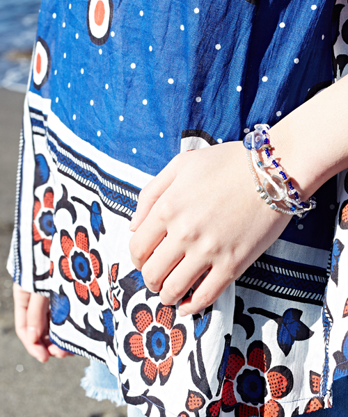 肌を明るく見せてくれる爽やかなカラーのブレスレット。夏の陽射しに映えるガラスビーズをたっぷりあしらいました。ボリューム感のあるアクセサリーで手元をクールに彩ります◎ ※こちらの商品は、職人による手作りとなります。その為、形や色合いなど若干異なる場合がございます。あらかじめご了承ください。 Amina Collection Co.,LTD.