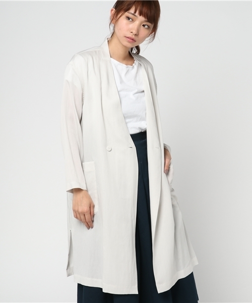 化繊のテンセル特有のひっやっとしたジャケットは落ち感が女性っぽく、クールに着用して頂けます。ネック部分は余計な衿がないので、巻物とも合わせ易く顔周りがスッキリして見えます。長めのロングタイプですがサイド深めにスリットが入っているので着用し易く歩くたびに動きが出るのもかっこ良いジャケットです。