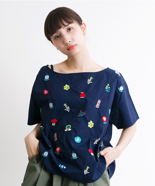 植物の鮮やかな色合いの刺繍が目を引くブラウスです。 Tシャツタイプなのでカジュアルに着ていただけます。 ベースはホワイトとネイビーの合わせやすいカラー展開となっています。 デニムとの相性も抜群です。