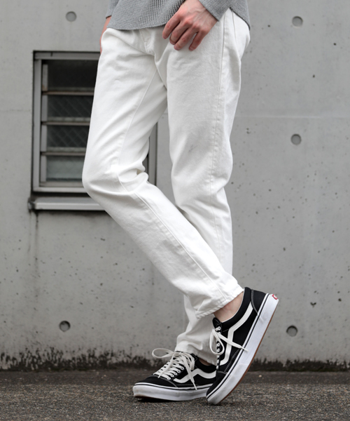 春夏のスタイリングに取り入れたい ホワイトデニムが登場! ALL MADE IN JAPAN! 生地、パーツ、縫製、最終仕上げ等 すべてを日本で生産したホワイトデニム。 14ozホワイトデニム 縦糸に7/-、横糸に6/-と太い番手を使用し 高密度な生地となります。 表面感はさっぱりとして品があります。 膝下から裾にかけてタイトにテーパードを効かせた スリムストレート型のホワイトデニムは、 肉厚で生地がしっかりしていることに加え、 スタイル重視で幅広いコーディネートに使える物を 作りたいと思いご用意いたしました。 ベーシックな5ポケットタイプ、 ZIPフライ、ペーパーパッチ仕様となります。 ”透けずに安心して穿けるホワイトデニム” ”しっかりとした生地感で穿きごたえのある1本” ”幅広いスタイルに合うスリムストレートシルエット” また、国内仕上げでありながら税込で1万円を 切るプライスもこだわりです。 ※パッチスタンプは1枚1枚手押ししています。 DM17SP04-M050、DM17SP04-M051の 新作デニムシャツとも相性抜群の1本です。
