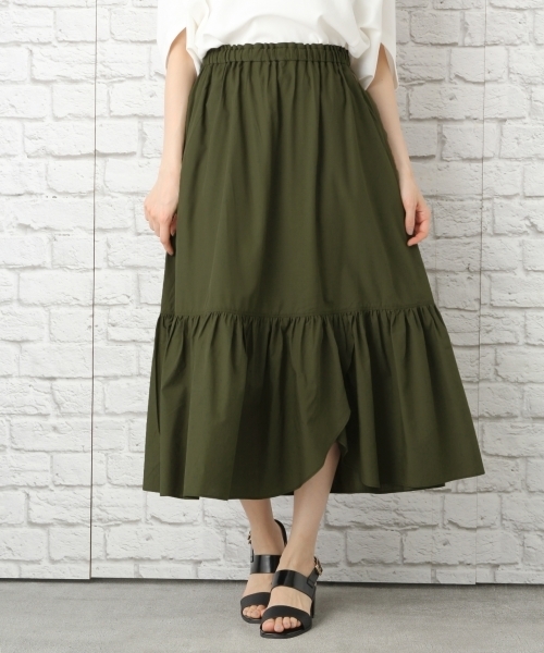 柔らかくなめらかな肌触りが特徴的なモダール混素材のティアードスカートは、嫌なハリ感がないのでボリュームも出過ぎずきれいなシルエットが魅力の1枚。 女性らしさのあるデザインなので、トップスはカジュアルなものでバランスを取ると◎ ペチコートパンツが付属で付いているので、スカートの中に穿くと安心です!