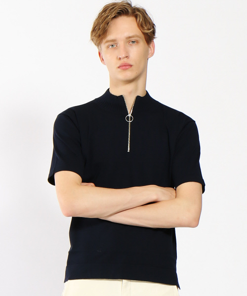 ジップがワンポイントのポロシャツ・ポロシャツでは珍しいジップのデザイン・ダレにくい天竺素材薄手ながらダレ感の少ないプレーティング天竺を使用。モックネックのジップデザインが特徴的。Tシャツ感覚でワイドパンツ合わせがオススメ。