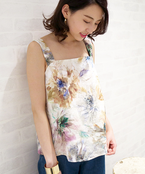 絵画のようなぼかしフラワーが大人っぽくどこか儚げなキャミソール!肩ヒモはちょうどいい太さなので着やすく、裾広がりでチュニックのようなリラックスしたシルエットです。前はベアのように真っすぐラインですっきりと、後ろは大胆に開いたヘルシーな色気を夏らしく仕上げています。気になる方はカーディガンを肩掛けすると安心感があります。デニムやワイドパンツと合わせて、都会的リゾート気分で着こなせます。
