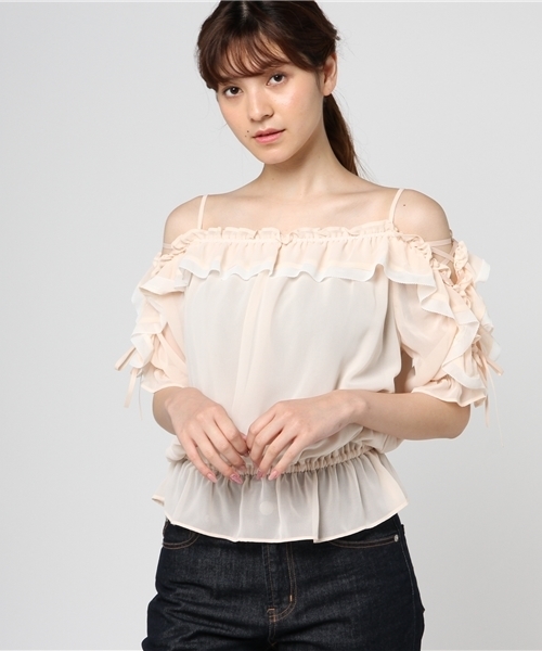 波打つフリルで立体的なフォルムを描くパフスリーブブラウス!腕部分はレースダウンになっていて、ちょこっと肌見せがセクシーなデザイン。胸まわりはゴムが施されているので着心地よく、身頃は裏地付きです。ウエストはブラウジングでエアリーでメリハリのある着こなしが出来る1枚です。