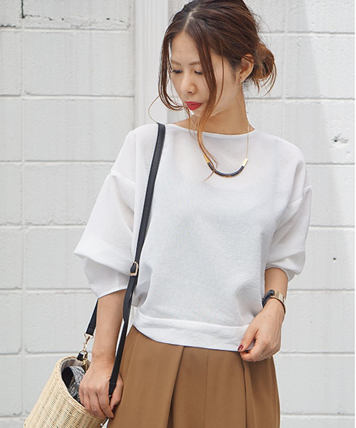 さらりとした風合い、落ち感のある素材で大人女子抜け感ブラウスを仕立てました。ドロップショルダーで肩のラインを華奢にみせてくれます。手元にほどよいヌケをつくる、5分袖に仕上げ女性らしい優しい印象を与えてくれます。後ろは釦開きで大きくスリットが開いています。インにおしゃれキャミソールをちらみせして後ろ姿にもぬかり女子スタイルがオススメです。後ろウエストリボンがアクセントになっています。※取り扱いについては、商品についている品質表示でご確認ください。※撮影に使用している小物雑貨はスタッフの私物になります。
