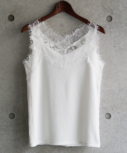【レース使いおしゃれキャミソール】 衿元に繊細なレースをあしらったフェミニンなキャミソール。 すっきりとしたネックラインが美デコルテを作り出しています。 前身頃はリブ素材で程よいフィット感があり、後ろ身頃はレース生地を使用した 後ろ姿にもぬかりなしの商品です! 薄手の素材や透け感のある素材を使用したブラウスなどとの相性も良く、さりげない おしゃれを演出してくれる素敵インナーです。トップスとしてもインナーとしても一枚あると幅広いシーズンで重宝するアイテムです。 ※取り扱いについては、商品についている品質表示でご確認ください。