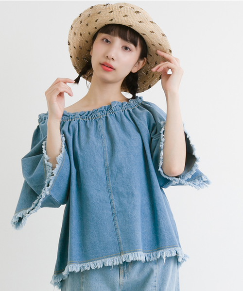 今季大注目のオフショルダートップスがデニム素材で登場。裾と袖部分がフリンジになっているのが今年らしいです。 シンプルなワイドパンツやフレアスカートなどとあわせて、ガウンを羽織ればトレンド感あふれるスタイリングに。 この一枚でさまざまなコーデがきまる優秀な一枚です。