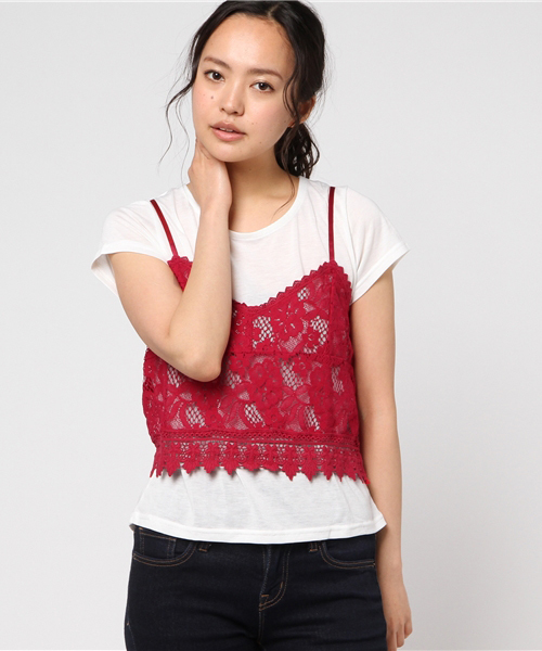 可愛いスタイルが即完成。レースキャミソールとTシャツのセットアイテム。 デニムに合わせるだけでトレンドコーデが完成しちゃうお手軽さが魅力! シングルユースもできるから、合わせるアイテムを変えて何通りも着こなしを楽しめます♪