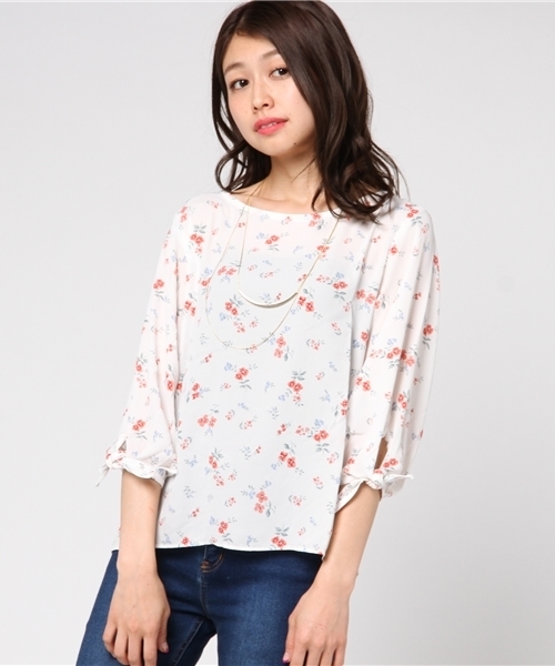 上品な印象のジョーゼット生地を使ったブラウス。 袖リボンのデザインがさりげなく可愛いワンポイントに。 合わせやすい無地&華やかなフラワー柄のデザインでオン・オフ活躍します。