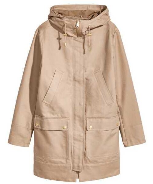 Parka in thick cotton fabric. Drawstring hood with adjustable tab. Flap at front with zip and concealed snap fasteners, diagonal handwarmer pockets, and patch pockets with flap and snap fasteners. Half-lined.