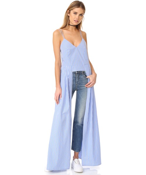 Exaggerated, pleated panels drape from the sides of this gingham Petersyn cropped tank. Spaghetti straps. Covered snaps close the back. Fabric: Shirting. 100% cotton. Dry clean. Made in the USA. Measurements Length 1: 19.25in / 49cm, from shoulder to shortest point Length 2: 57in / 145cm, from shoulder to longest point Measurements from size S