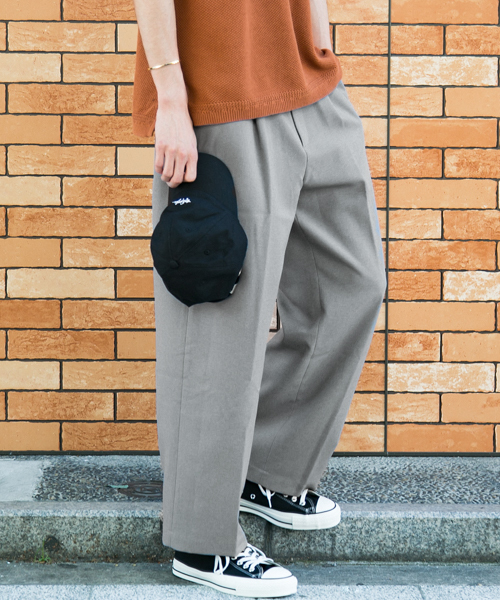 ウーリータッチの合繊ファブリックのワイドパンツ。いわゆるワイドスラックスのように、ドレッシーではなく、アクティブに使えるスポーティーなエッセンスを感じさせます。街ではオープンカラーシャツや、ポロシャツと、アウトドアシーンではTシャツやサンダルとコーディネートしたくなる、シーンレスに使えるトレンドアイテムです。