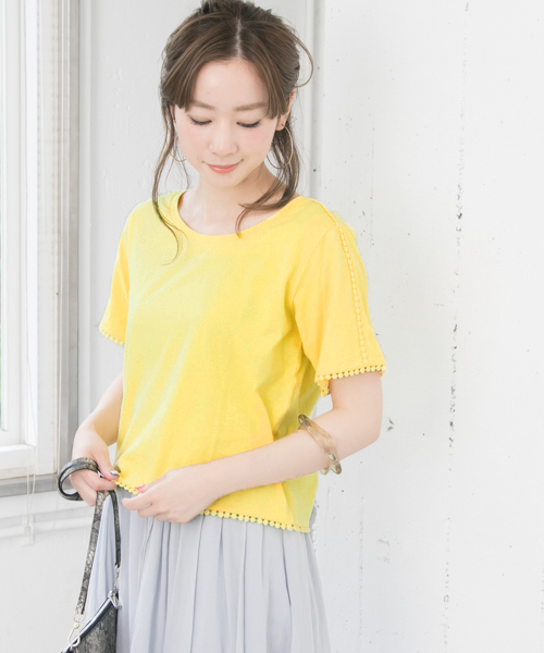 このアイテムはWEB限定商品です。 お袖と裾のラインにつぶつぶのレースを施したシンプルながらこなれた印象のTシャツ。 詰まり過ぎないネックラインと横幅を持たせたシルエットが女性らしく、カジュアルな印象の強いTシャツとは一線をおいた新鮮な1枚に仕上がっています。 ベーシックカラーから今季トレンドのイエローまで飽きないカラーリングでご用意。ワードローブのバリエーションを広げてくれる優秀な1枚です◎ ※透け感あり