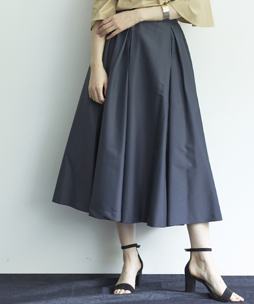 ◆大人スタイルに欠かせないロングフレアスカート◆サラッとした素材で、裾にかけてふわっと広がるシルエットなので足さばきも軽やかに。 ランダムにタックが入っているので、こなれた雰囲気も。 ウエスト部分は後ろだけゴム仕様なので、着心地もバツグンでトップスをインしたスタイルもキレイに決まります。 Tシャツとあわせてラフなスタイリングからブラウスとあわせてキレイめなスタイリングまで、幅広いコーディネートにマッチします。