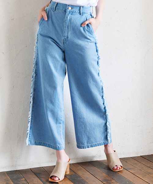 サイドのフリンジが今っぽいデニムワイドパンツ。ボリューミィなワイドパンツもフリンジの縦ラインがスッキリ見せしてくれます。安っぽくないしっかりコットン100%デニムを使用。カジュアルなTシャツともブラウスとも相性バツグン。足首がチラッと見える絶妙な丈感はヘルシーでシーズンムードが高まる1枚です。 ◆素材しっかりしたコットン100%デニム。伸縮性なし/透け感なし/裏地なし◆ケア方法・色落ちしますので他のものと一緒に洗わないでください。・お洗濯の際はお手洗いをおすすめ致します。・アイロンをかける場合は中温でご使用ください。◆注意事項*撮影場所やイメージにより実際の商品と色味が若干異なる場合がございます。商品のお色味はカラーバリエーション画像をご参照ください。