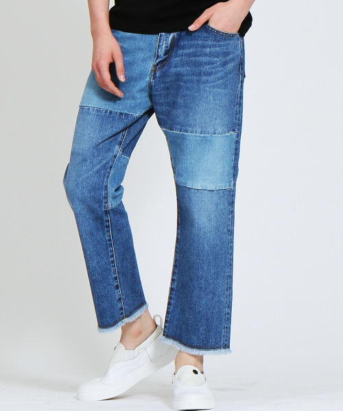 デザイナー拘りの1本・濃淡の違う生地で切り替えた遊びのあるデザイン・トレンド感のあるワイドシルエットデザイン性の高いリメイクデザインのワイドパンツ。濃淡違うデニムを組みわせたメリハリのあるデザインが特徴です。ワイドシルエットのカットオフ仕様にする事でトレンド感もある1本に仕上がっています。※3枚目の画像の切り替え部分の素材が1枚目の切り替え部分の素材と同素材になります。