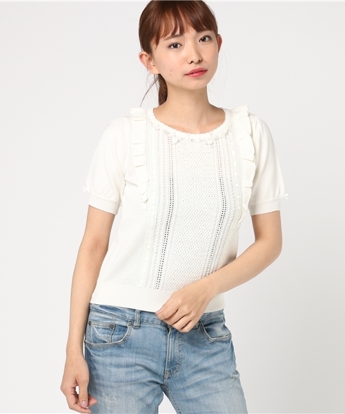 女心をくすぐる愛らしいディテールが満載の半袖ニットです。ネックラインには軽やかな素材のリボンにパール×ビジューを散りばめ、アクセサリー要らずの華やかさを演出しています。フリルデザイン、ギャザースリーブもポイントに。