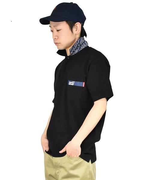 左胸のポケットハギにDOUプリントを施した ポロシャツ。襟裏にはバイアスロゴが線書きで 入る。別地はデニムを使用。