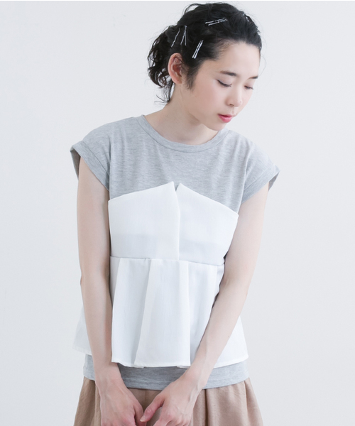 タックフレア裾のビスチェ×Tシャツのお洒落なトップス。後ろ部分はギャザーになっており、シルエットを綺麗にみせてくれます。 1枚でどんなボトムスと合わせてもこなれ感のあるお洒落なコーデにしてくれるのでとても優秀です。 ワイドパンツやゆるっとしたデニムなどとあわせるのがおすすめです。