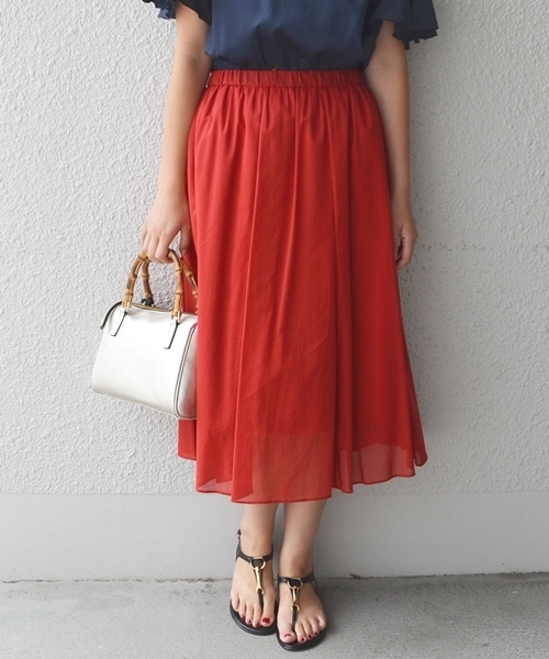 薄手でシャリ感のある素材が魅力のスカート。 手洗い可能なのも嬉しいポイント。夏場まで涼しく着ていただけるアイテムです♪ ※末永く愛用頂く為に、アテンションタグを必ずご確認の上、着用又はお取り扱い下さい。