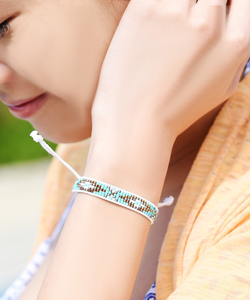 鮮やかなオルテガ柄のビーズブレスレット。 2本重ね付けや他のアクセサリーと合わせてこなれた印象に。 着脱とサイズ調整は紐を引っ張るだけのラクラク仕様。 どんなコーデにも合わせやすい ターコイズとブラックのカラーで、 ユニセックスでお楽しみ頂けます。 ◆注意事項 *撮影場所やイメージにより 実際の商品と色味が若干異なる場合がございます。 商品のお色味はカラーバリエーション画像をご参照ください。