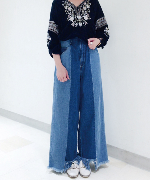 ハイウエストで綺麗な美脚ラインのデニムワイドパンツ。すっきりと締まったウエストラインと程よく広がったメリハリのあるラインが魅力的なデニムパンツです。