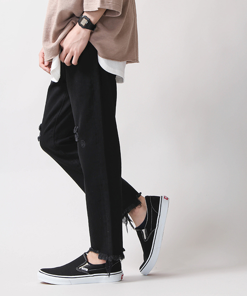【SamuraiELO 6月号掲載商品】柔らかな穿き心地で仕上げたスリムシルエットのデニムパンツ。裾に向けてゆるやかにシェイプをかける事により、脚のラインにフィットするテーパードシルエットと涼しげなクロップド丈が魅力。全体に施したクラッシュデザインと裾のフリンジ加工が、手軽に着こなしのアクセントになるひと品。また、程よくハリのあるライトオンスのデニム生地を使用している為、涼しく快適に着用頂けます。幅広い着こなしに対応してくれる、スタンダードな3色展開でご用意しました。定番のデザインながら、細部や加工にこだわり、年をまたいで長くご愛用頂けるひと品です。