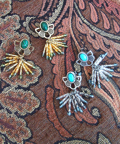 【Lluvia/ジュビア】コロニアルフラワービーズフリンジピアスジュビアが送る新ライン、シリーズごとにひとつの国や地域をコンセプトとする「旅するジュエリー」第一弾のテーマは「メキシコ」。陽気でありながらどこか退廃的であった古の空気感を表現しています。スペイン統治時代のコロニアル建築をイメージした、丸みのある透かしパーツはもちろん型から作ったオリジナルです。はめ込まれた天然石はどこかなつかしいレトロ感のあるカラーでイメージにマッチ。1点1点ハンドメイドで製作した分量感たっぷりのロングビーズのフリンジは、微妙に色を変えて立体感と揺れ感で耳元にインパクトをプラスします。同シリーズで、ピアス2型、イヤリング2型、リング、バングルがございます。※天然石のため1点1点個体差がございます。※メッキには特殊加工を施しており、表面にムラがございますが不良ではございません。【lluvia(ジュビア)】スペインはアルハンブラ地方。イスラム文化とヨーロッパ文化が絶妙なバランスで共存する街。そんな街をインスピレーション源とした、新しくもなつかしい、モードでいて、民族を感じる、まったく新しいアクセサリーブランドです。イスラム文化の象徴のひとつ、美しい直線から成る「アラベスク」柄をオリジナルの透かし柄としてひとつひとつデザインを起こし、型から作成したパーツを全アイテムに使用しています。シンプルな装いに、自分らしいスパイスを。おしゃれ感度の高い大人のための、こだわり抜いたアイテムをお届けいたします。