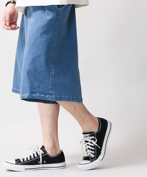 ストレッチ混の生地で仕上げたデニムショーツ。ボリューム感のあるボックスシルエットが、手軽に着こなしのアクセントになります。股上をやや深くとり、バックウエストをゴム仕様にする事でリラックスして快適に着用頂けるひと品。膝丈の穿きやすさはそのままに、シルエットで遊び心をプラスしたデザイン。人気のロング丈トップスやスニーカーと合わせるような着こなしも今季オススメです。