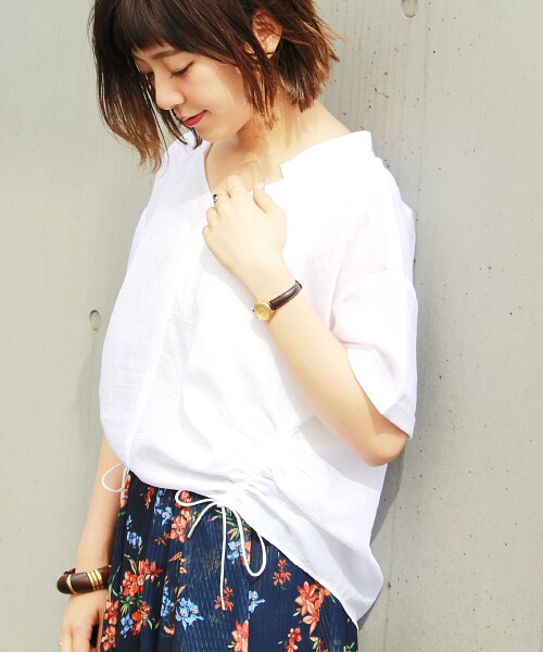 裾部分のシャーリングがスタイルアップして見せてくれるデザインブラウス。絞りは調節可能なので、ボトムによって長さをチェンジするとオシャレ!首元の空きも女性らしく、カジュアルに着ていただけるブラウスです。