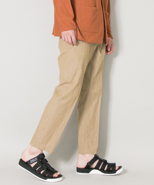 【MADE IN JAPAN ITEM / 日本製】 夏のリラックスパンツの代表格 高品質なジャパンメイドで到着 通期速乾性に優れ、シワ感やフシのある豊かな表情のリネン混トラウザー。 一般的なイージーパンツのイメージとは一線を画すテーパードの美しいシルエット、見た目にも爽やかなアンクル丈。 リネン100%では、ユルいイメージになりすぎますが、コットンベースにしているため、しっかりと、芯のある履き心地&生地感になっています。 サンダルとの相性が良く、暑い季節に外せないパンツです。 ※この商品は、素材の特性上、ネップ(糸が部分的に太くなっている部分)や織りムラ・染めムラがございますので、予めご了承ください。 ※その他お取り扱いに関しましては、商品に付属のアテンションタグをご確認の上、充分ご注意ください。
