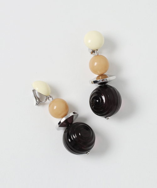 アクリル素材を使ったデイリーに使いやすいレトロデザインのイヤリング。一番下のボールには模様がほられており、クリアカラーは夏らしさを感じれるカラーとなっています。