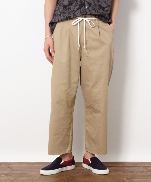 人気のワイドパンツにチノ素材が登場。 裾がカットオフ仕様なので、かっちりした生地感のチノパンでも抜け感が出るようデザインされています。 また、このアイテムの一番のポイントなのが「ウエストのベルトがシューレース(靴ひも)」であること。 じわじわと人気を集めているタックインの着こなしがクールに決まります。 また、ご自身の好きな細さに調整して穿けるというところもポイント。 もちろん、タックインせずにそのまま穿いてもOK! 旬のワイドパンツだからこそ、周りと差がつくアイテムがオススメです。 <ウエストの紐をシューレースにするのはなぜ?> ベルトをせずに靴ひもでしばる、この着こなしはスケーターが発祥とされています。 トリックの時にベルトのバックルがお腹に当たってケガをするということから、 スケーターは「ベルトをしない」人が多いんです。 コーディネートのアクセントになることから、あえて靴ひもでしばる人が今急増中! 今シーズンマストなこの着こなし、是非お試しください! ※光の当たり具合で、商品と画像の色に若干差がある可能性がございます。ご了承ください。