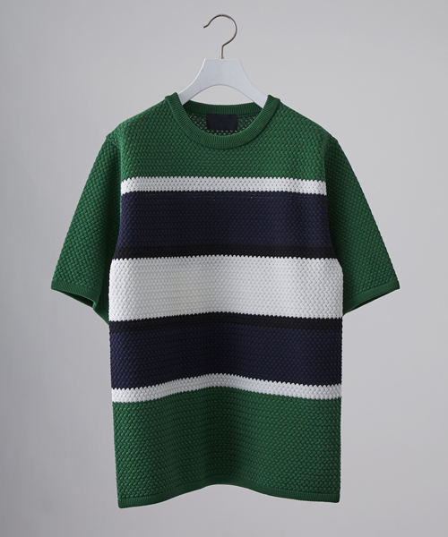 ■STUDIOUS HIGH■ 上質な素材と品のあるモードデザインに拘った、ファッションを楽しむ大人の男性に向けたスタイルを提案。 【Fabric】 撚りを強めにかけた綿100%の強撚糸を使用。 度詰めに編みたて型崩れしにくいのもポイント。 強撚にすることで夏らしく清涼感のあるシャリ感を出しております。 凹凸感が特徴的なバスケット編みを採用し、ニットならではの立体感を表現。 【Design】 ややゆったりめのリラクシングなシルエット。 ランダムピッチのボーダー柄をデザインに落としこみ、他と差の付く1着に仕上げております。