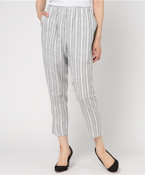 マルチストライプのメリハリで、レッグラインがすっきりと見えるテーパードパンツ。 ウエストシャーリングはトップスインした時に様になり、うれしいゴム使いでお腹周りもリラックス。 ラクちん&美脚を叶えてくれる優秀ボトムです。 [クリーニング]手洗い可ドライクリーニング可(F)ウェットクリーニング(W)