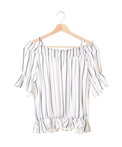 フェミニンな肌見せが叶うオフショルダーデザインのトップス。キャンディーの包み紙のようにフィット&フレアな袖口のシルエットがトレンドライクな仕上がりに。肩紐は取り外し可能なので、肩を落としてオフショルとしてはもちろん、その日の気分やコーデによってアレンジしても◎。1枚で存在感あるルックスなので、ワイドパンツやデニムなどを合わせてカジュアルダウンさせるのがオススメです。ポイントを押さえたデザインで、スタイリングの主役にぴったりの1枚。・裏地なし・肩紐取り外し可・肩紐サイズ調整可・5分袖