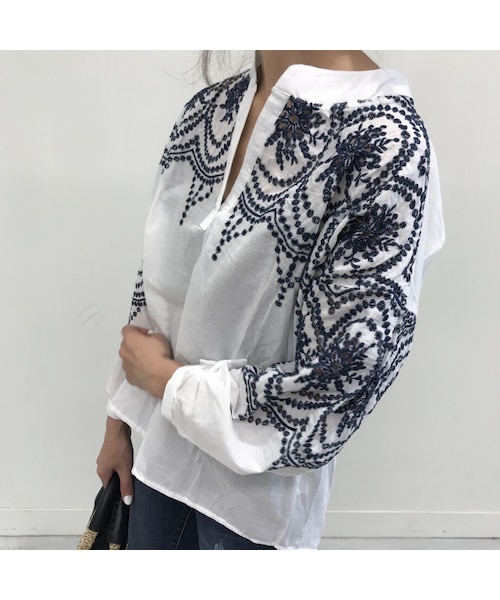 透け感のある柔らかい生地と丸みのあるボリュームスリーブが魅力的な大人の刺繍ブラウスです。 ネイビー単色のパンチング刺繍なので、大人っぽく仕上がります。 また、スキッパーデザインがデコルテラインを綺麗に見せてくれ、抜け感スタイルも簡単に完成♪裾は、後ろが長いラウンドヘムなのでお尻が隠れるのも嬉しいポイントです♪ デニムと相性抜群!ボトムインやチュニックとしても使えるトレンドアイテムです☆ ※身長161㎝ ☆クリックポスト☆ ・送料全国一律210円 ・代引き不可 ・クリックポスト対象商品のみ可能 ・追跡サービスあり ・対象商品1点に限りご利用頂けます。 ・ポスト投函となります為、日時指定が出来かねます。 ・出荷から2~7日程度かかります。 配送目安 関東2.3日前後 東北東海関西3.4日前後 中国四国九州4.5日前後 北海道沖縄6.7日前後 ・クリックポスト対象商品を2点ご注文いただいた場合は、2点目は送料無料にさせて頂きます。発送は、1点づつ別々に発送させていただきますので予めご了承下さい。 ※配達中に商品の紛失や破損が起こった場合の補償がございません。 万が一、紛失や破損等が起こった場合は当店での補償は出来かねますので、ご了承頂いた上でのご注文をお願い致します。 ◆宅配便をご希望の方は、配送料600円(沖縄1500円)になりますので、商品欄の『ゆうパックご希望の方専用』を一緒にご注文お願い致します。 また、クリックポスト対応商品ではない商品と一緒にご注文いただいた場合は、自動的に宅配便にてまとめての発送となります。 ◆カラー ホワイト(刺繍部分ネイビー) ◆サイズ F 着丈:前62cm 後ろ68cm 身幅:57cm 袖丈:37.5㎝(肩切替部分から) ※多少の誤差は予めご了承下さい。 ◆素材 綿100% ※刺繍のバランス、模様の出方は一点一点異なりますので予めご了承下さい。