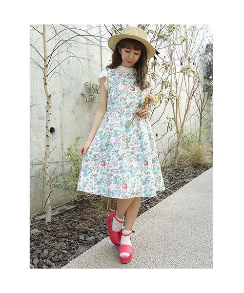 レトロなフラワーベースのオリジナルプリントが可愛らしいワンピース。 後ろの細い共布リボンでバックスタイルもガーリーに決まります◎ インナーやカーディガンを使ってスタイルチェンジができるので、着回しを考えるのが楽しくなりそう…♪ MATERIAL: モデル身長: 150cm 表地 ポリエステル100% 裏地 ポリエステル100% made in China サイズ着丈胸囲肩幅ウエスト Free 90cm89cm35.5cm77cm 【ご注文確定前に必ずご確認ください】 いつもF i.n.tをご愛顧頂きありがとうございます。 STORESの在庫掲載については、F i.n.t代官山店と在庫を共有しているため、在庫更新のタイミングにより在庫切れの場合やお届けまでお時間を頂戴してしまう可能性がございます。 商品を他店舗よりお取り寄せの場合には、通常よりお届けまでにお時間がかかる場合がございますので、恐れ入りますが予めご了承ください。