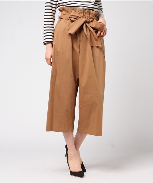 適度なハリ感できれいなワイドシルエットがキープができるテーパードパンツ。くしゅっとしたペーパーバッグウエストがポイントに。ウエスト部分は、ゴム仕様なので、楽に着用していただけます。共生地のベルトでウエストマークすれば旬のスタイルが決まります。