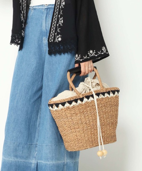 メイズ(とうもろこしの皮)で編んだ柔らかな天然素材のトートバッグです。 三角形の生地やカシメなど、エスニックな装飾が、春夏らしいリゾートムードにぴったり。 大きな間口にはしっかり巾着が付き、中身が落ちることがなく防犯面も安心・安全。 巾着のコードには大きなウッドビーズが付き、こちらもナチュラルなアクセントです。 普段着から、リゾートワンピに合わせたお出かけルックまで夏のお供に最適。